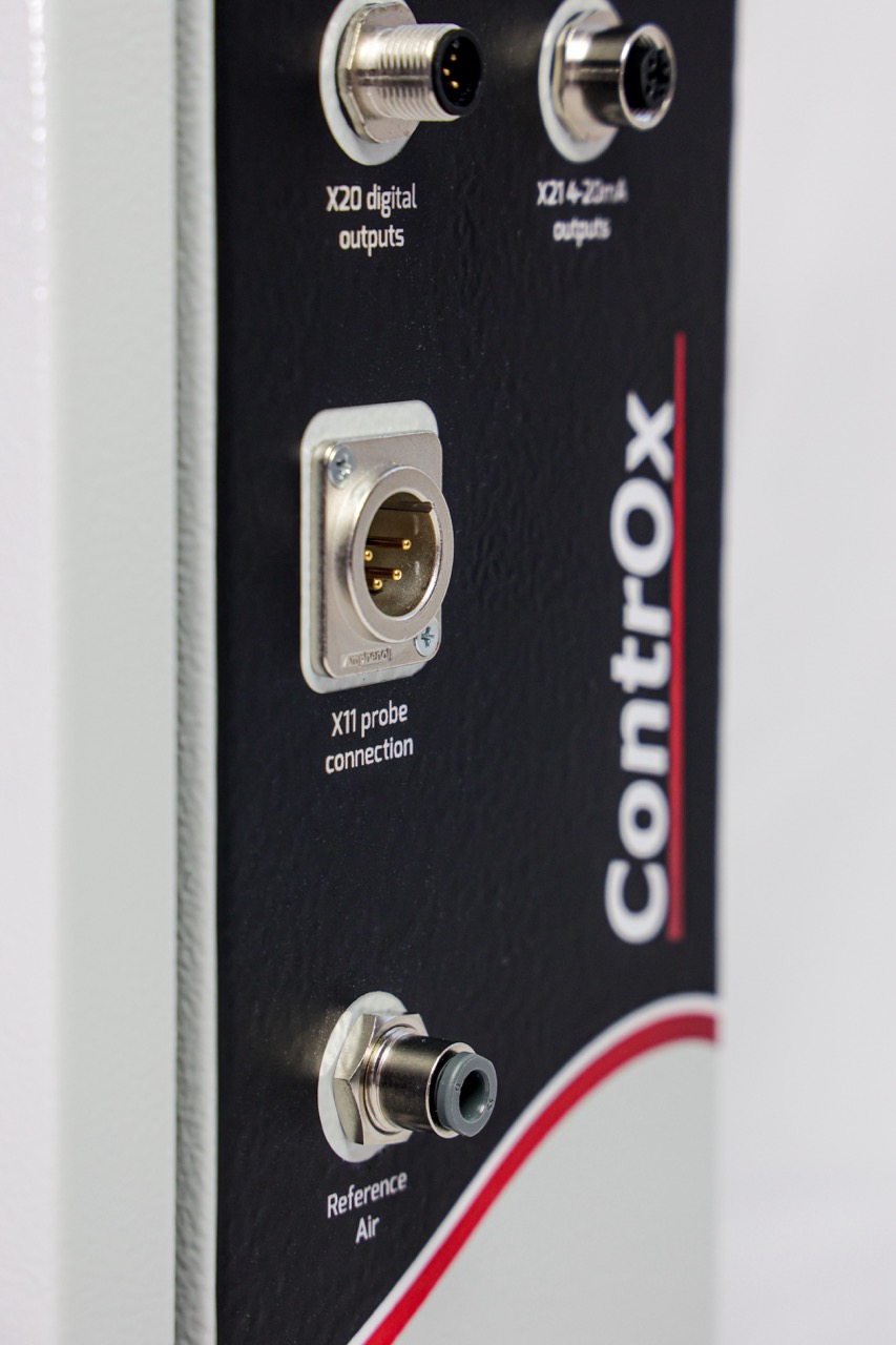 Le module ControX permet le calcul et l’affichage de la concentration en oxygène (%O2, ppm ou log) ainsi que de la température de la sonde (°C ou °F). Les connecteurs sont facilement accessibles sur le côté du boitier et permettent le branchement des prises pour les sorties analogiques, 4-20 mA, air de référence et air de nettoyage (CarboProbe LT seulement). L’export sur clef USB est compris en standard.